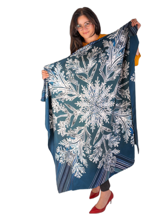 | Šátek inspirovaný sněhovou vločkou nese poselství křehkosti a síly. Každá vločka je jedinečná, a přesto v jednotě tvoří harmonii – stejně jako lidé, kteří v propojení nacházejí oporu a smysl.