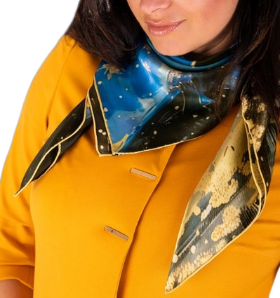 Menší šátek působí jako luxusní náhrdelník. Cípy jsou kratší, zůstávají blíže u krku a vytvářejí jemný, decentní efekt. Skvěle se hodí k halenkám, košilím nebo topům, kde šátek nahradí šperk a outfit získá sofistikovaný detail. |
