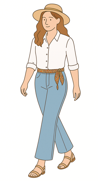 Šál Boho výšivkový sen: Uvázaný jako pásek dodává outfitu osobitý a hravý nádech. Tradiční vzor inspirovaný výšivkami se krásně vyjímá na jednoduchých džínách a vytváří zajímavý kontrast mezi ležérností a originálním detailem. Tento styling je ideální na víkendové procházky, výlety i letní cestování, kdy šál působí jako nenucený, ale nepřehlédnutelný doplněk. |