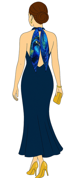 Šátek Noční svit: uvázaný kolem šíje, splývá přes odhalená záda a stává se šperkem celého outfitu, zvýrazňuje večerní noblesu a dodává originální barevný akcent. Cípy můžou mít elegantní uzel, lze použít zlatý prsten či šperk místo úvazu. |