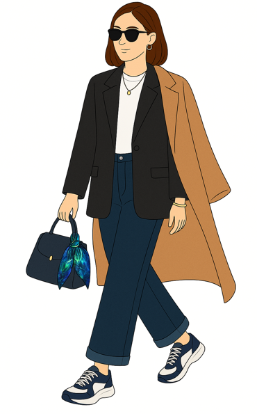 | 4. Městský vycházkový outfit | Styl: ležérní elegance, která spojuje pohodlí streetwearu s nadčasovými kousky a nechává vyniknout barevný akcent šátku. | ||