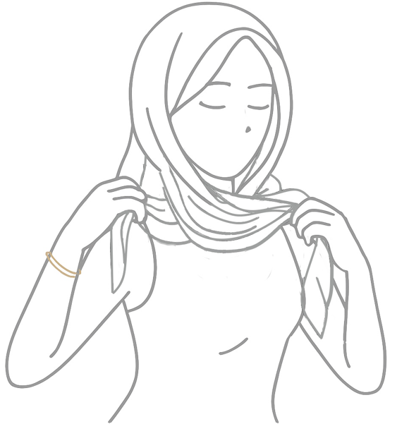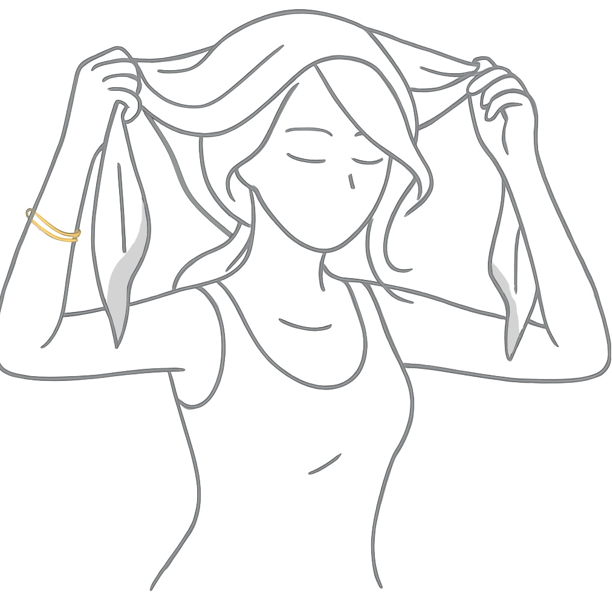 Krok 2 — Překřiž pod bradou Postranní cípy veď dopředu pod bradu, překřiž je a jemně dotáhni. Dbej, ať zůstane přední hrana hladká – účes bude chráněný a elegantní. |