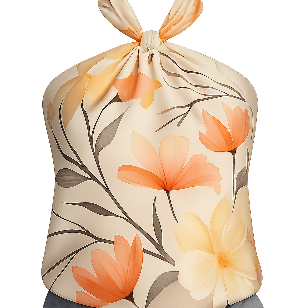 Díky velkorysé velikosti šátku (135 × 135 cm) se nabízí i další variace. Cípy můžete uvázat výš – pod prsy, nebo naopak níž – až v pase. Štíhlé postavě často dovolí i zavázání vepředu, s uzlem elegantně schovaným pod předním lemem. Pro ještě uhlazenější vzhled lze volné konce zastrčit do kalhot či sukně, nebo je provléct poutky kalhot a zajistit třeba malými  nenápadnými uzlíky. Tím vytvoříte styl, který drží tvar po celý den, a působí jako originální top na míru.