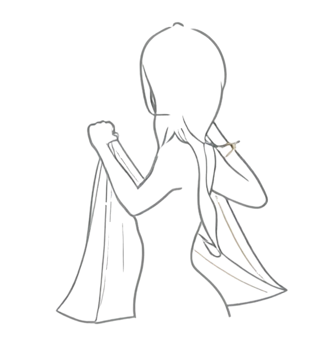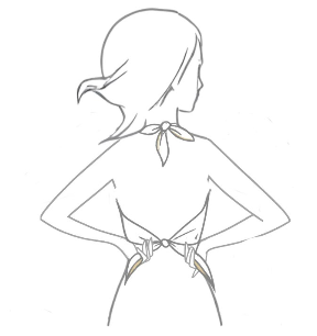 Spodní cípy šátku přiveďte k sobě na zádech a uvažte je do uzlu v oblasti pasu. Tím šátek zafixujete a získáte elegantní siluetu bez potřeby další úpravy. Uzel můžete umístit buď přímo na záda, nebo mírně do strany pro asymetrický efekt.