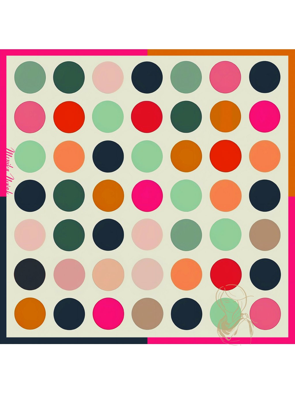 Tento šátek je doslova paletou barev a tvarů, které se harmonicky prolínají. Každý barevný puntík přináší energii a živost do jinak minimalistického designu. Kombinace barev, jako je oranžová, tmavě modrá, růžová, béžová a světle modrá, vytváří hravý, ale elegantní vzhled, který se hodí jak k formálnímu, tak k ležérnímu stylu. Unikátní jsou i kontrastní okraje v růžové, tmavě modré a okrové, které šátek ještě více oživují.