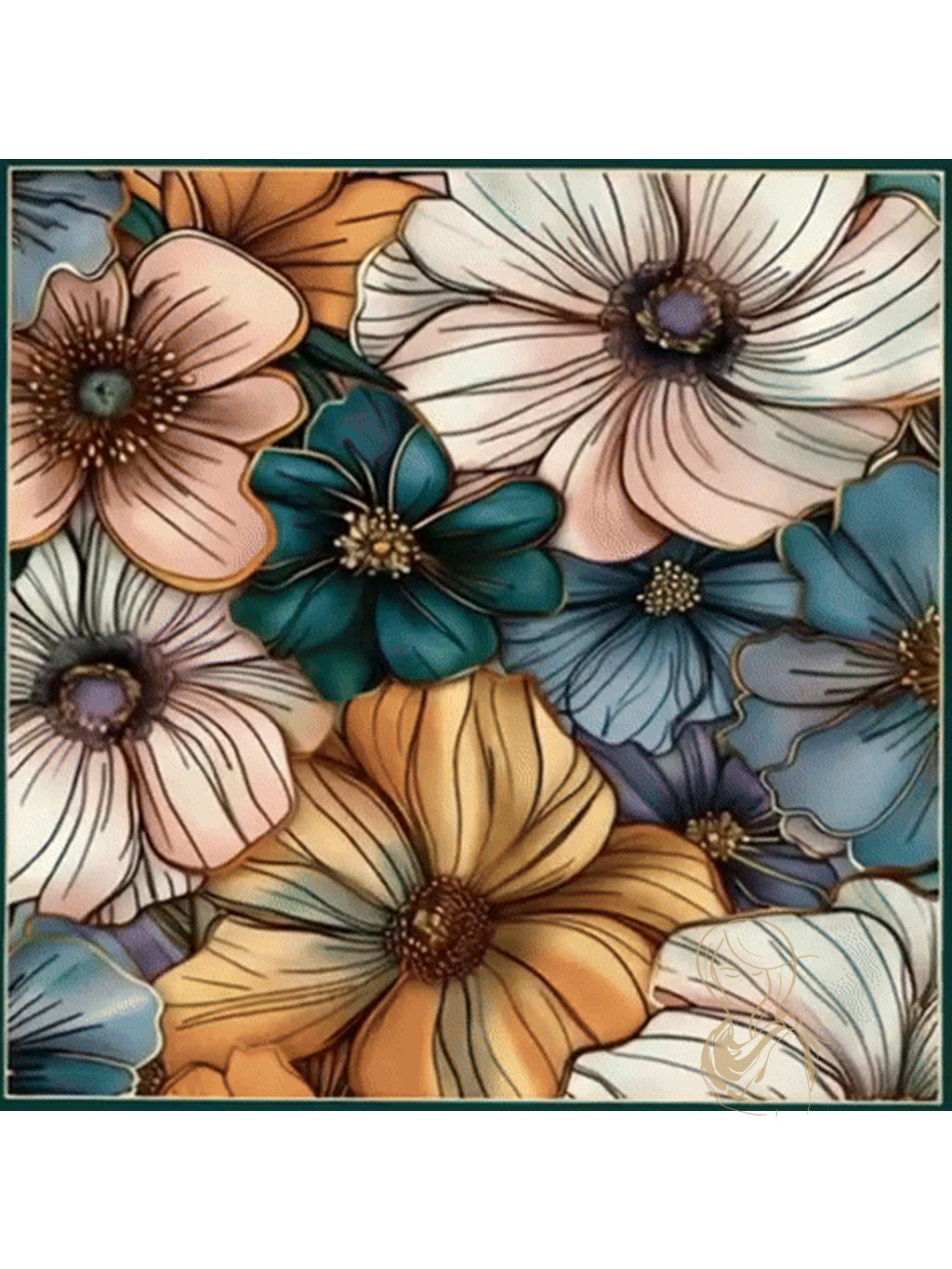 Hedvábný šátek Květinový sen v sobě spojuje bohaté barvy a jemné detaily, které přinášejí svěží eleganci a radostný nádech. Pastelové tóny růžové, modré a krémové se prolínají s výraznými akcenty tmavě tyrkysové a teplé oranžové, což vytváří krásnou harmonii barev. Každý květ je pečlivě vykreslen s jemnými liniemi a stínováním, čímž působí živě a přirozeně.