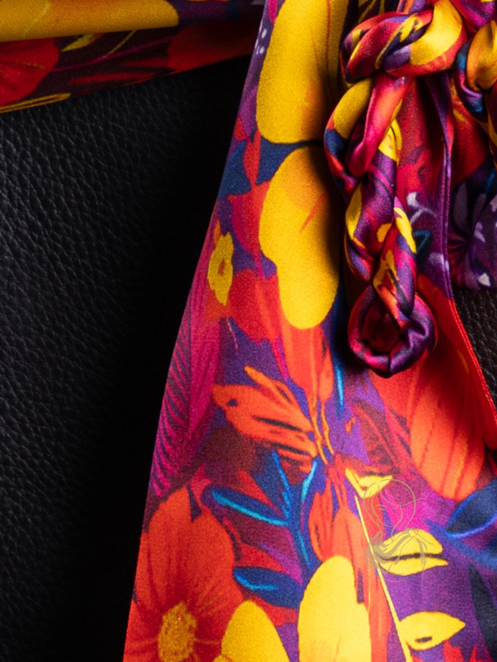 Živý twilly šátek s výrazným boho vzorem, který působí jako umělecké plátno. Expresivní malba květin ve fauvistických barvách přináší do stylu hravost, volnost a chuť užívat si každý okamžik léta. Pro ženy, které se nebojí být vidět a vnímají oblékání jako radostný rituál.