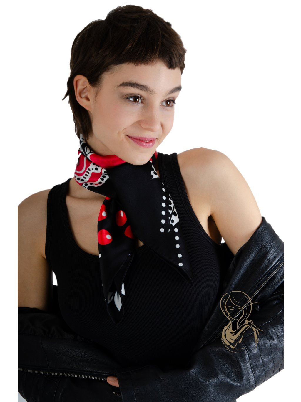 Hedvábný šátek Noční euforie je oslavou kontrastů a smyslné elegance. Živé odstíny růží v syté růžové a červené vystupují z hluboké černé jako vášnivý tanec světla a stínu. Detaily bílých puntíků a jemných křivek dodávají designu moderní hravost, zatímco dramatické barevné spojení vyzařuje sílu a odvážnou ženskost.
